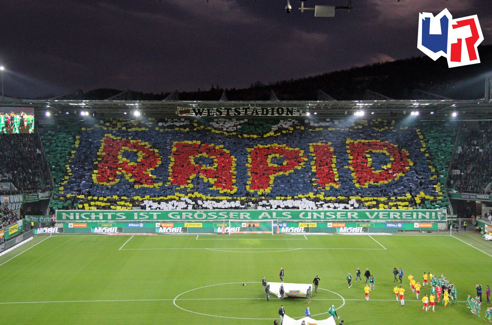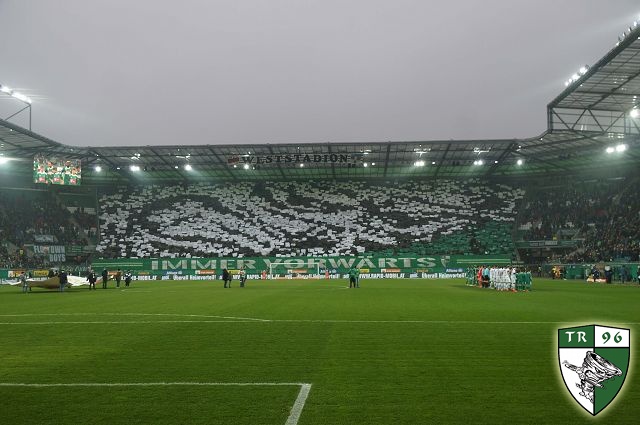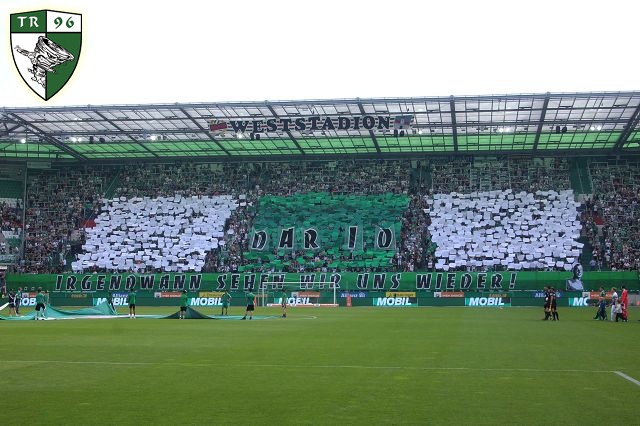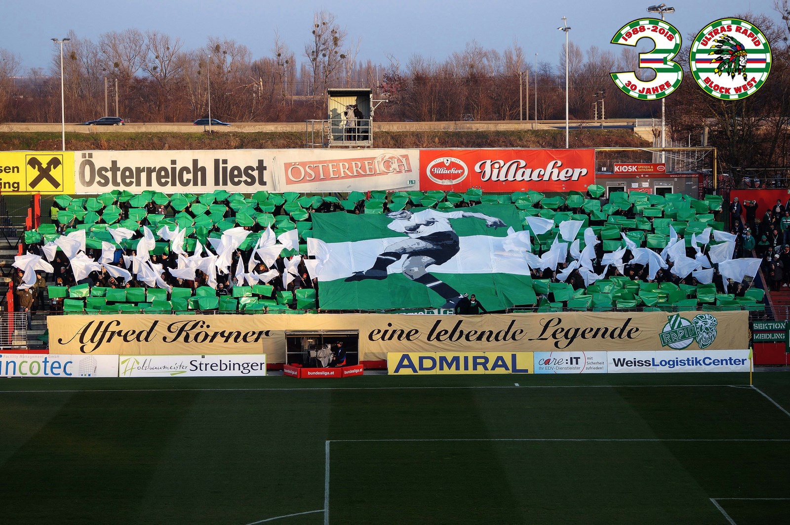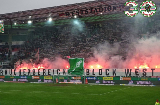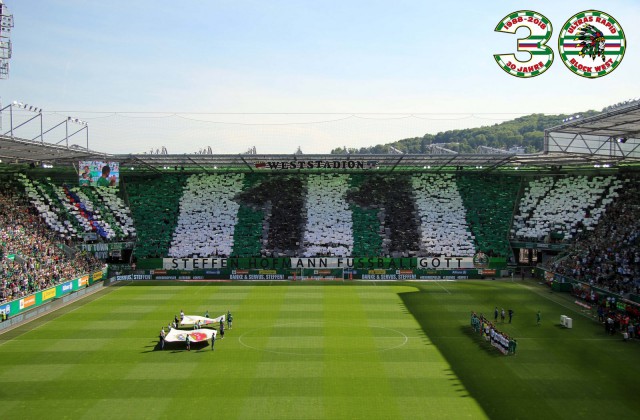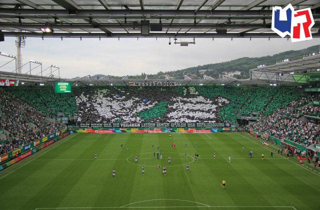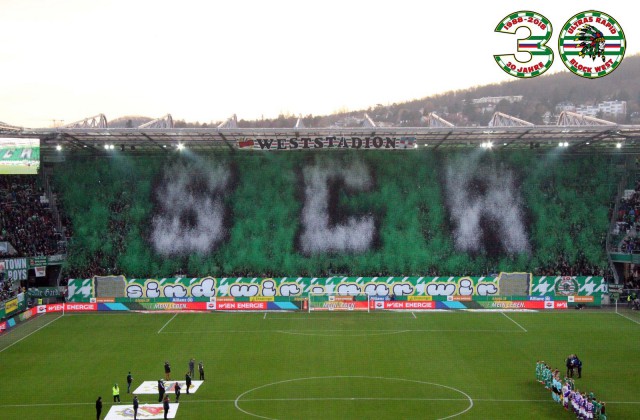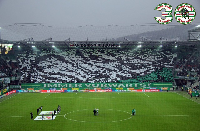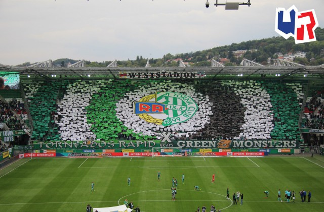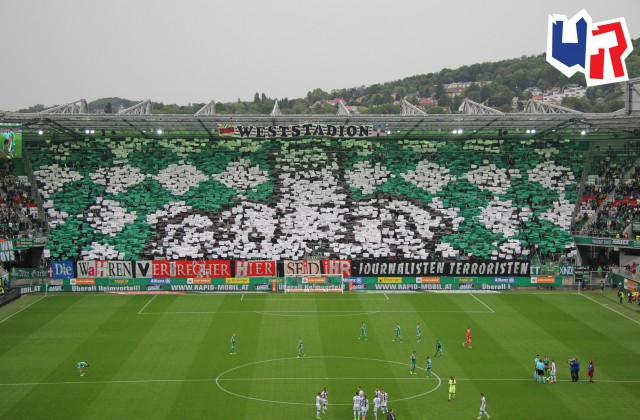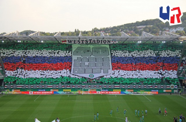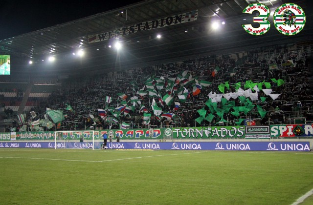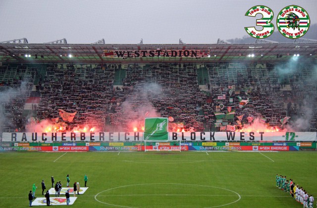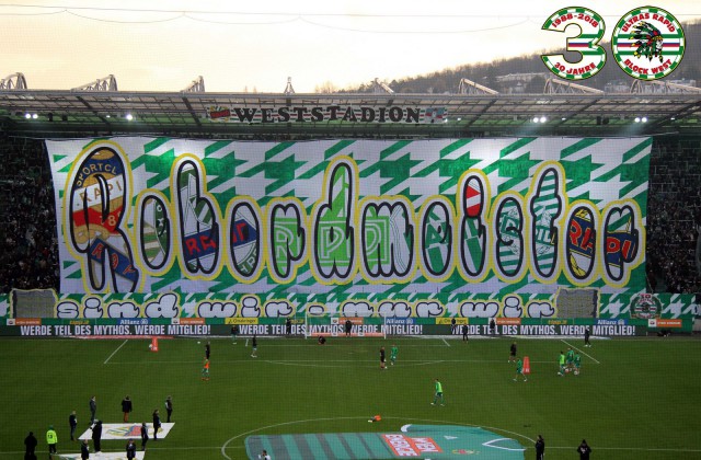 Перфоманс к 40-летию "Block West"! Тут нужно пояснить: "Block West" - это фанатская трибуна на стадионе "Вестштадион", на котором ранее выступал "Рапид". Этот стадион носил имя Герхарда Ханаппи - великого австрийского футболиста, который всю карьеру провёл в составе "Рапида". Так как Ханаппи по образованию был архитектором, то он сам и спроектировал "Вестштадион". В 2014 году устаревший стадион был снесен, а на его месте клуб возвел новенький стадион "Альянц".