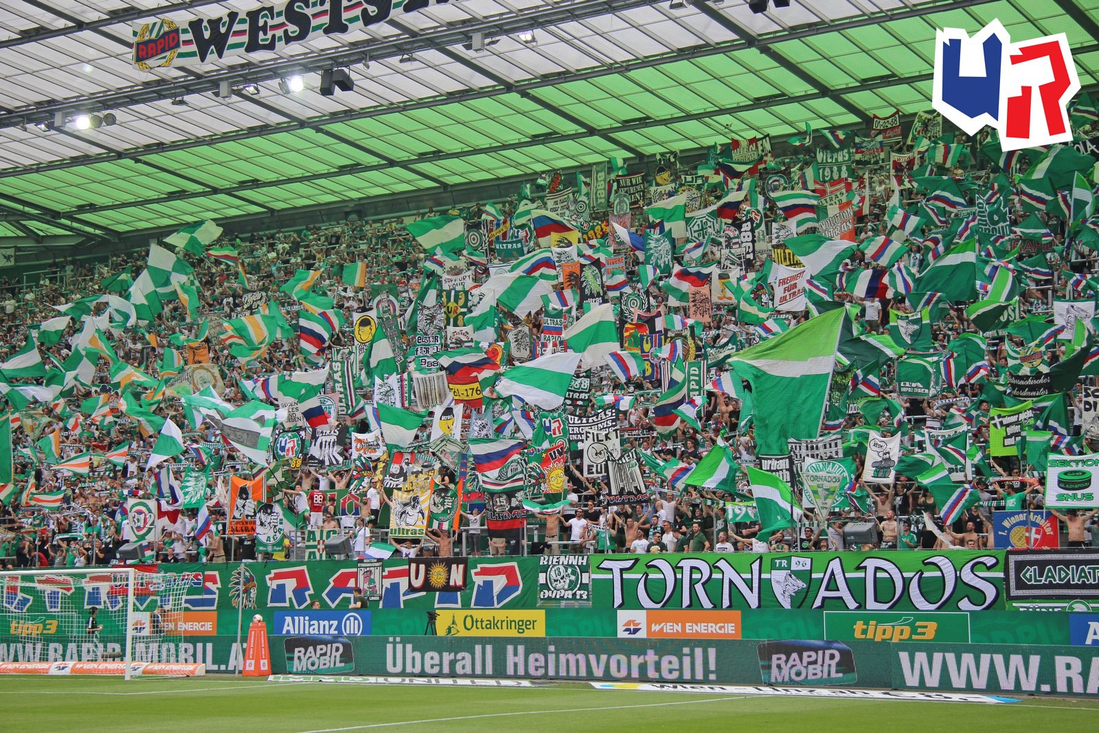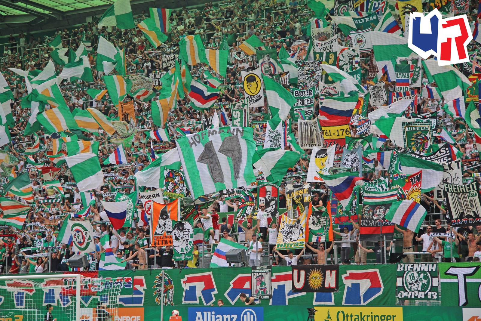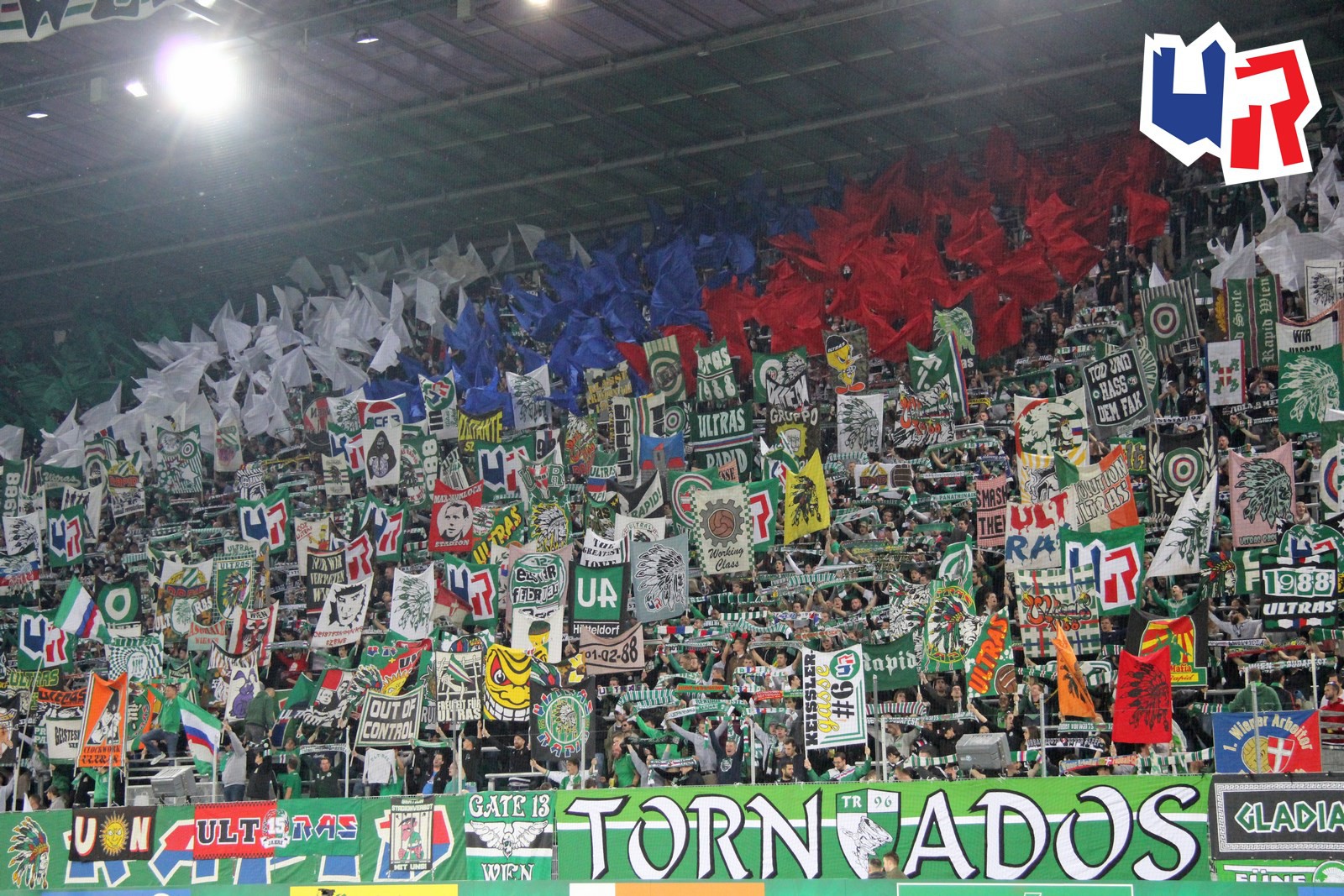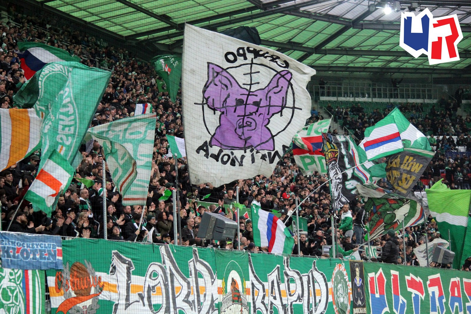 Фанаты "Рапида" - одни из очевидных лидеров европейской ультрас-сцены по части эффектного оформления своей трибуны с помощью различного стаффа - флажков, флагов, двуручников. Трибуна - чистый кайф!