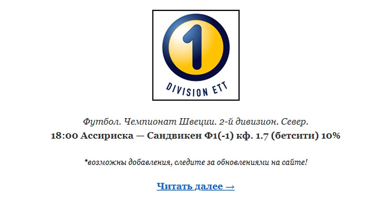18:00 Ассириска — Сандвикен Ф1(-1) кф. 1.7 (бетсити) 10%