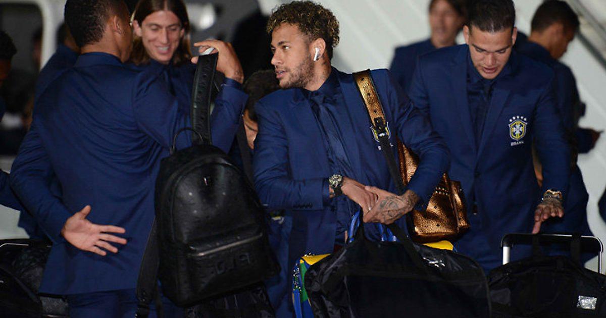 Неймар – главная звезда сборной, и когда он спустился с трапа, все обратили внимание на золотой рюкзак бразильца.