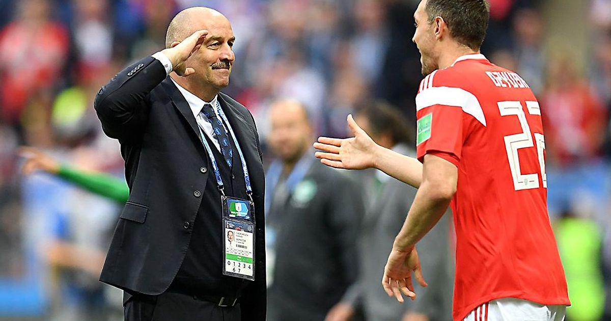 Главный тренер сборной России Станислав Черчесов оригинально отпраздновал третий гол своей команды в ворота Саудовской Аравии, который забил Дзюба, в стартовом матче ЧМ.