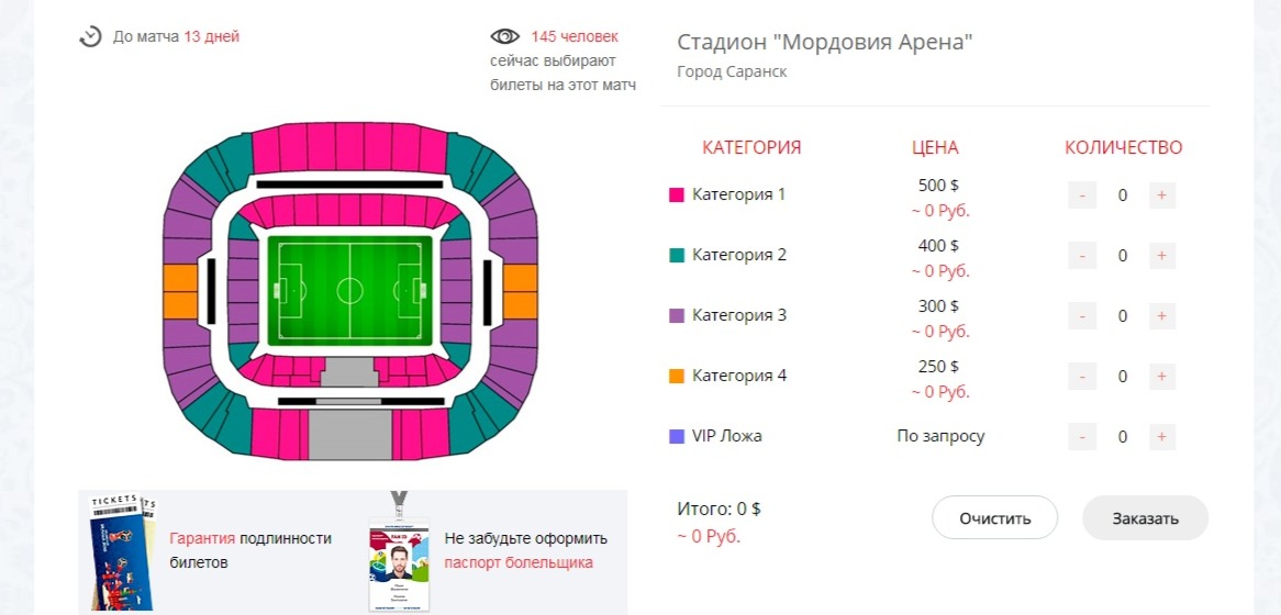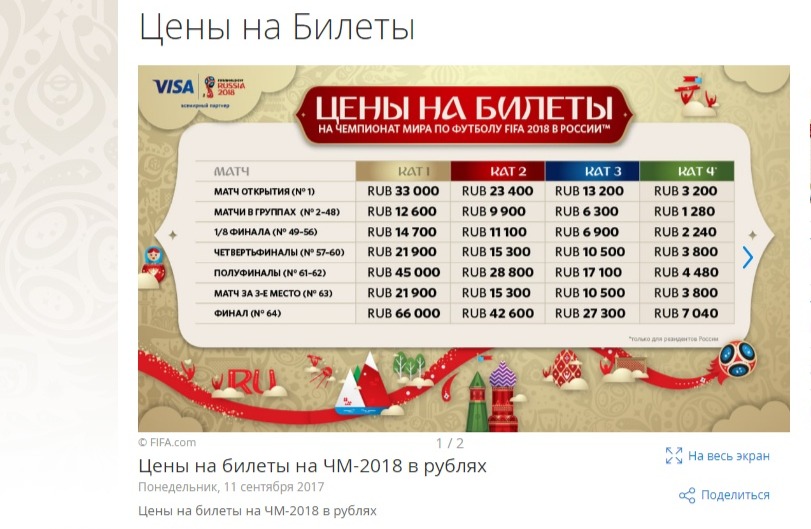 С посещаемостью на стадионы проблемы из-за ценников не билеты. В Москве и Питербурге с зарплатами проблем нет, но в других городах страны проблемы с деньгами у многих. Вот так должны выглядеть цены на билеты на Чемпионате мира, скрин с официального сайта фифа.