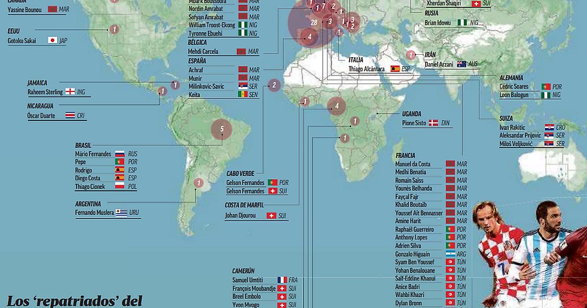 Марокко, Тунис и Сенегал лидируют по количеству игроков, которые родились в других странах. Основным "поставщиком" для них стала Франция — три этих африканских государства раньше были её колониями. Среди европейских сборных много мигрантов у швейцарцев.
