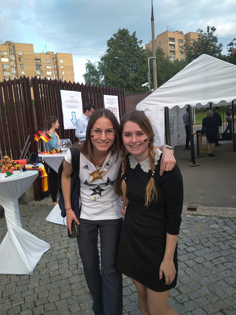 Более двухсот поклонников футбола и немецкой команды собрались 17-го июня в дипмиссии для совместного просмотра матча Германии и Мексики. Кроме самих сотрудников посольства, в закрытом мероприятии приняли участие представители МиД, официальных спонсоров Сборной Германии, а также ограниченный круг сотрудников масс-медиа России и Германии: ТАСС, Deutsche Welle и, как оказалось, «Бундеслига.Ру» в лице редактора блога Али Синецкой и авторов блога Арти Бундевицы и Софьи Кривошеиной.