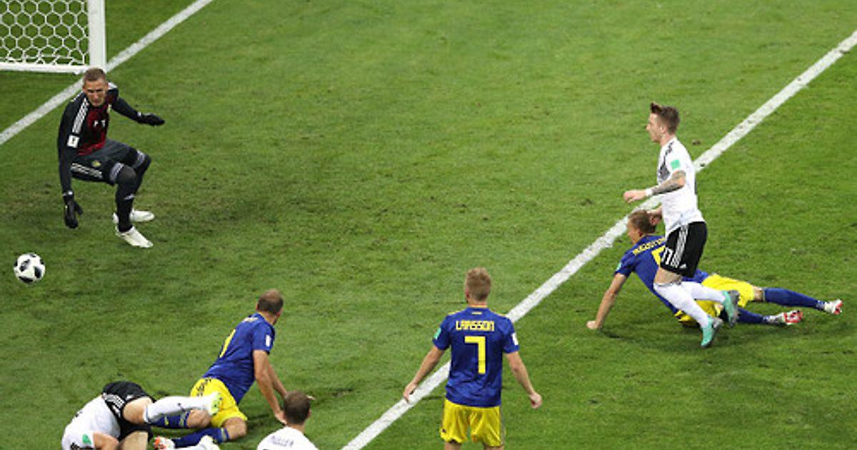Номер один. Шведы упускают Мюллера после исполнения штрафного с левого фланга - удар головой неточен.