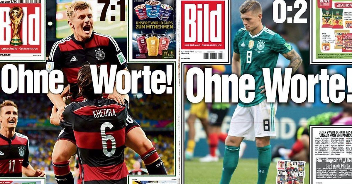 Немецкая газета Bild после поражения Германии от Южной Кореи (0:2) и вылета с ЧМ-2018 вышла с заголовком «Нет слов».