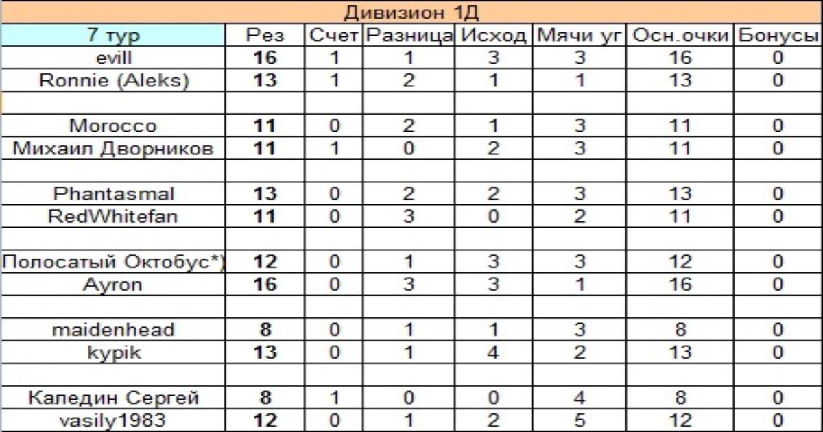 Эвилл очень опасался Ронни (Алекса), так как тот угадал чуть ли не больше всех счетов в турнире, эвилл угадал в два раза меньше, поэтому он должен был задавить соперника какой-то другой своей фишкой. В итоге получилось задавить исходами и мячами. Да, и по одному счету оба угадали: эвилл сделал это в матче Твенте-ПСВ, а Ронни угадал ничью Майнца-Фрайбурга 1-1. Теперь эвилл - на третьем месте, а не везучий Ронни - на десятом. Забивает он очень много, но и пропускает еще больше.