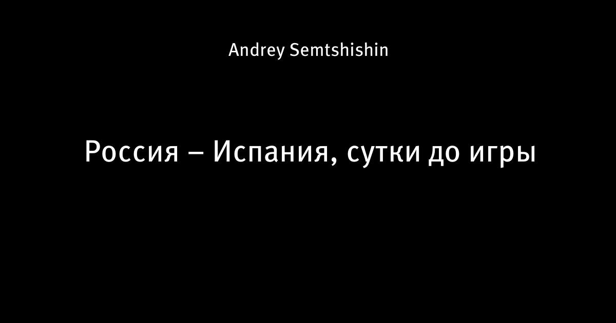 30 июня 2018, 15:05 Россия – Испания, сутки до игры Автор Andrey Semtshishin Этот пост опубликован в блоге на Трибуне Sports.ru. Присоединяйтесь к крупнейшему сообществу спортивных болельщиков! Другие посты блога Россия-2025 Сборная Испании по футболу Сборная России по футболу