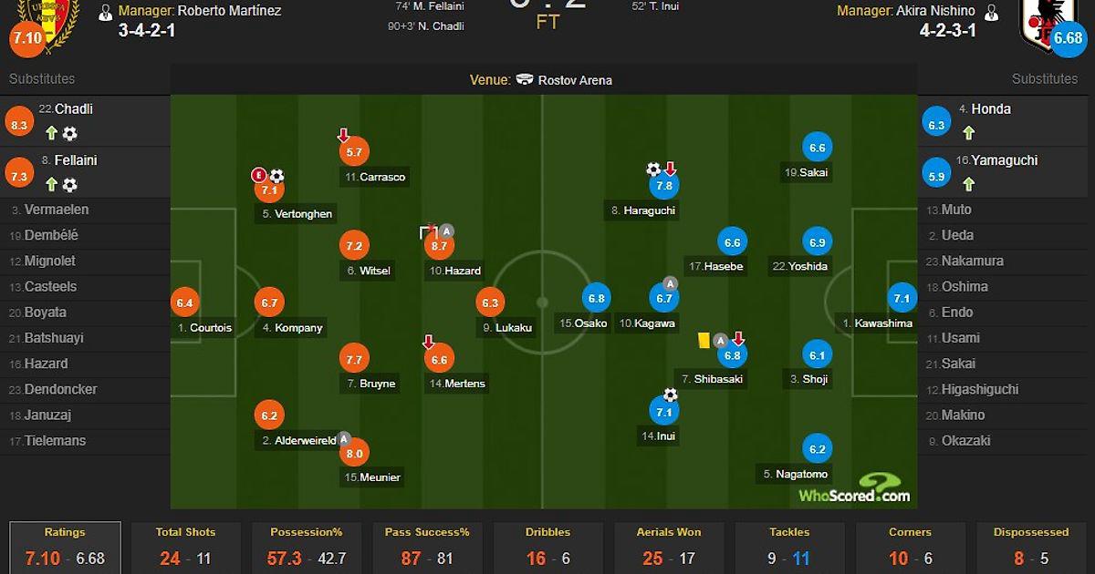 А вот карраско настоящий мусор .Все невпопад ,потери ,1 ускорение нормальное .Нет слов порол по 2 момента за атаку .Не знаю как тренер держал этот мусор .С его фланга Азар навесил на гол Маруана ,Лукака стояло за спинами японцев,как обычно.