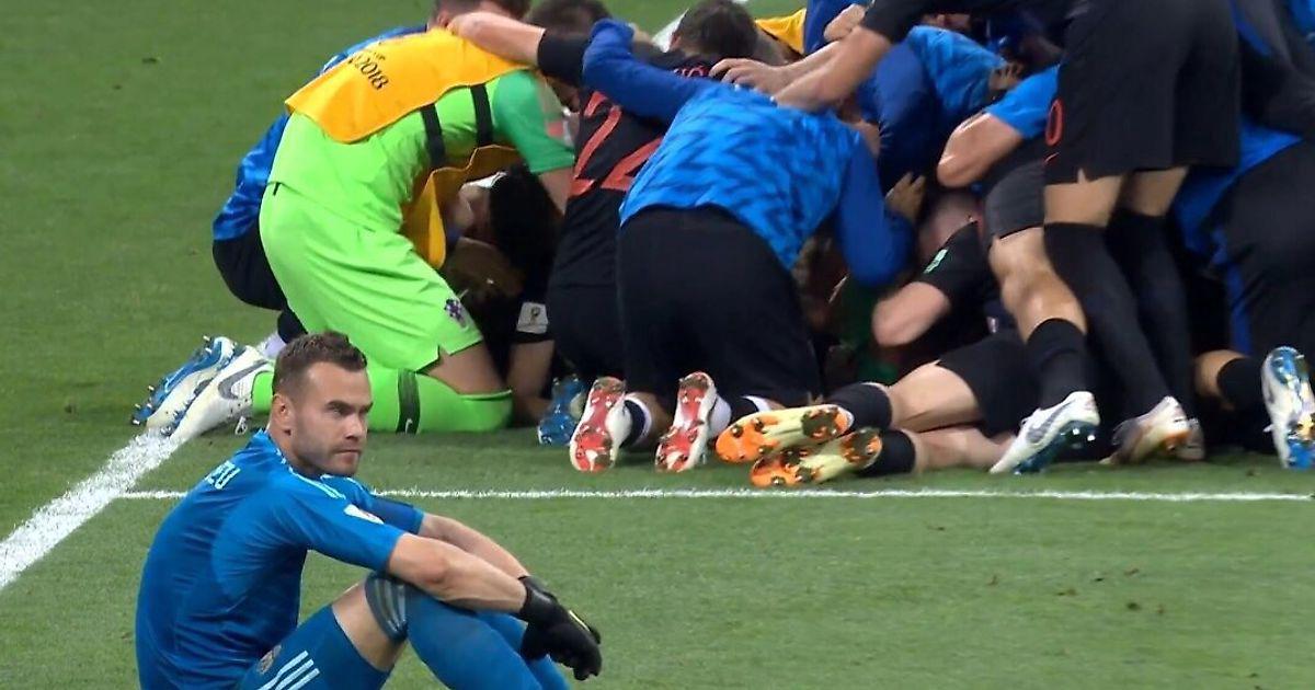 Серия пенальти: 0:0 - Смолов (вратарь), 0:1 - Брозович, 1:1 - Дзагоев, 1:1 - Ковачич (вратарь), 1:1 - Фернандес (мимо), 1:2 - Модрич, 2:2 - Игнашевич, 2:3 - Вида, 3:3 - Кузяев, 3:4 - Ракитич.