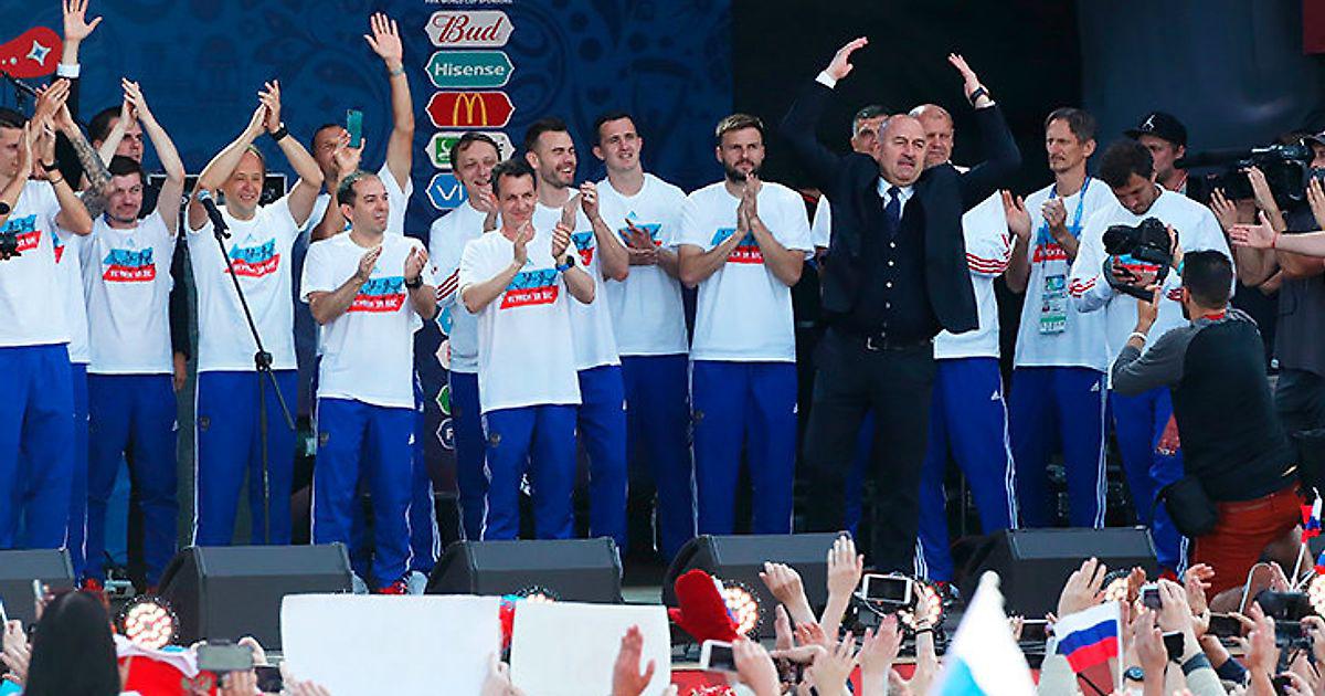 Пока игроки делали селфи, повернувшись к толпе спиной, Черчесов пошел к народу. Заводил его двумя руками, как на предыдущих матчах, уходил вглубь сцены, но снова возвращался. Ему нравилось управлять людьми – и под конец Черчесов вращался так, будто у него в руке дирижерская палочка. Его последнее действие на сцене – фото со всей вратарской бригадой: Акинфеевым, Габуловым, Луневым и тренером вратарей Стауче.