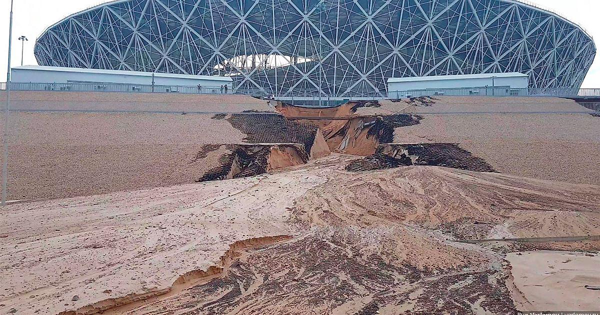 Ливневые дожди в Волгограде (двухмесячная норма осадков) размыли насыпной склон возле стадиона, на котором во время ЧМ играли Англия, Нигерия, Польша и другие сборные. Поток воды с глиной и песком сошел от арены к берегу Волги. Разрушилась построенная к ЧМ-2018 пешеходная дорожка.