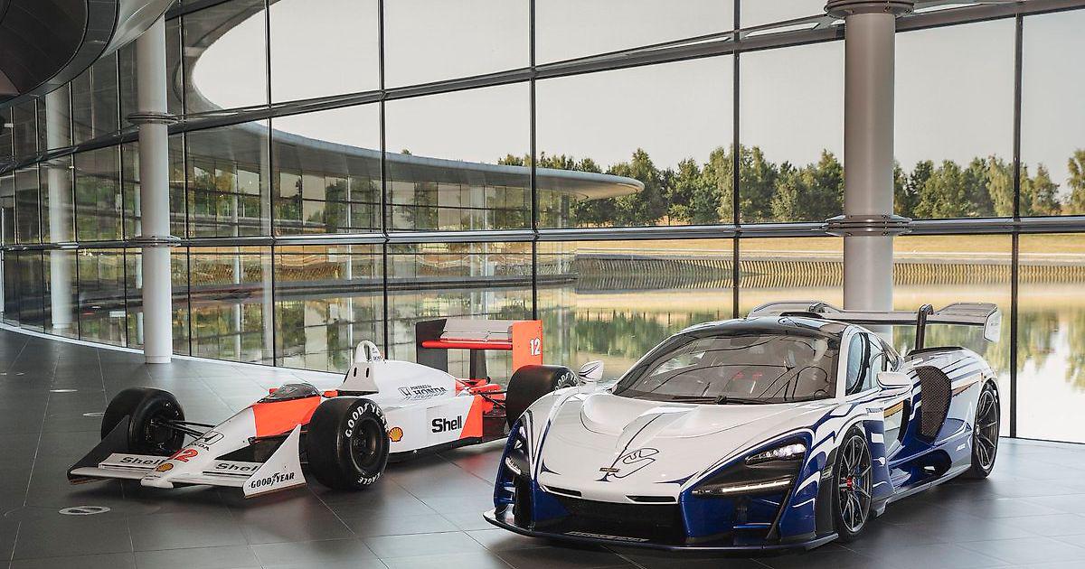 McLaren Senna chassis 001 представлен в юбилейной белой краске с синей ливреей. Автомобиль проехался по близлежащей от базы "Макларена" трассе.
