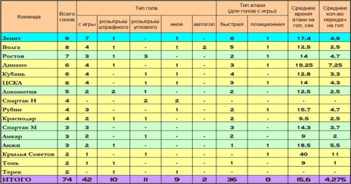 Всего с начала чемпионата 42 мяча забито с игры (57%), голы после «стандартных» положений разложились следующим образом – 12 после розыгрыша углового (16%), 9 после розыгрыша штрафных (12%), 6 с пенальти (8%), 3 гола было забито прямым ударом со штрафного (4%). Еще два мяча (и оба в пользу «Волги»!) было забито игроком обороняющейся команды – 3%.