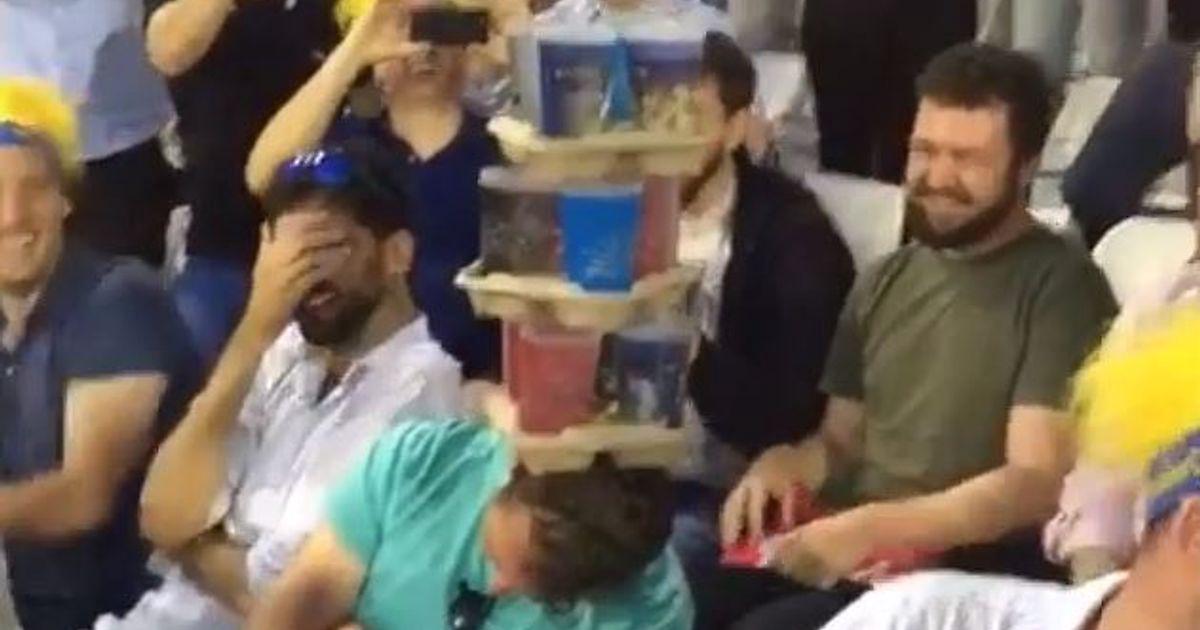 Парень уснул на футболе, и на его голове выстроили пирамиду из стаканов