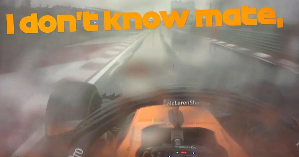 Фернандо: Думаю, нам надо остаться в гараж и следить за условиями. Мы можем ехать на дождевой резине, но будем медленнее на 25 секунд — а нам нужно улучшить 11-ю позицию.