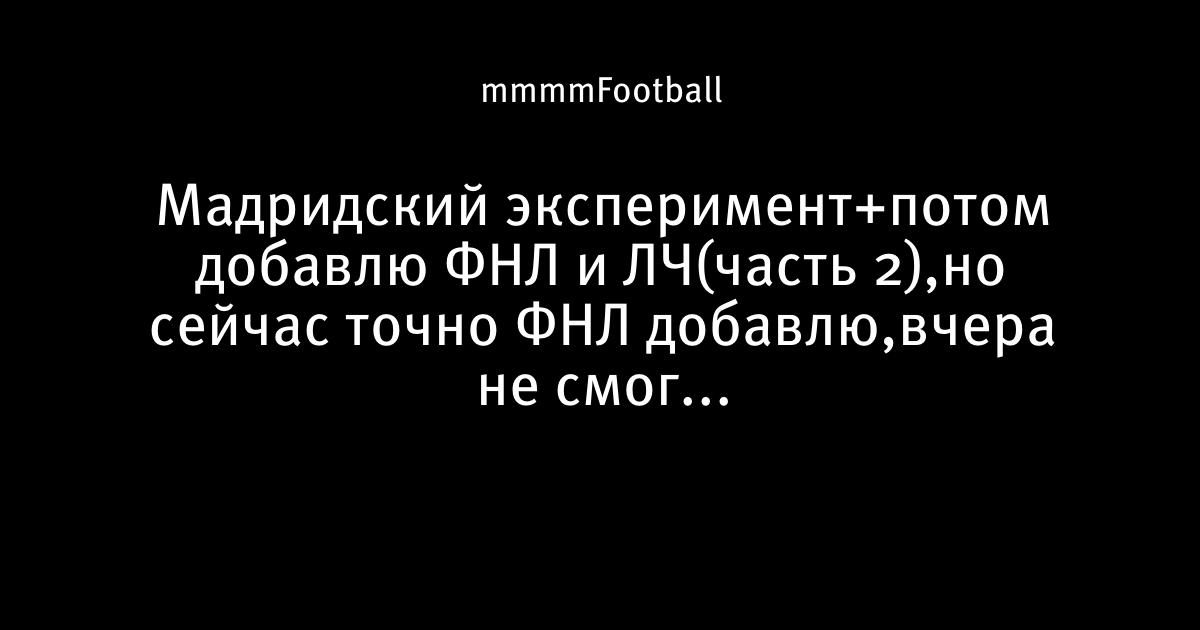 Мадридский эксперимент+потом добавлю ФНЛ и ЛЧ(часть 2),но сейчас точно ФНЛ добавлю,вчера не смог...