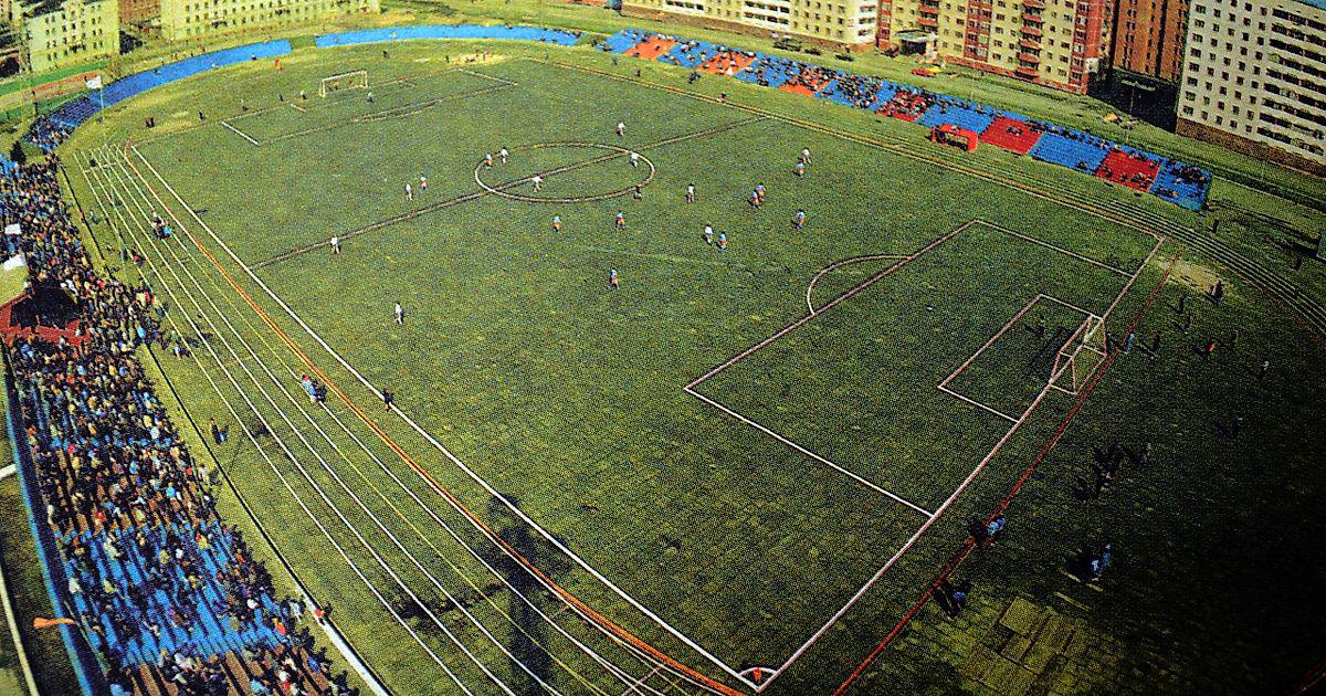 Норильск. Начало 90-х. Легендарный заполярный стадион "Заполярник" с заполярной же методикой укладки газона. Устроителям ЧМ такое и не снилось. Обратите внимание на структуру поля и беговых дорожек. Да-да, она в клеточку! Это резиновые пластины, поверх которых лежит тонкий слой дёрна, мха и лишайников. Всё потому, что Заполярье и мерзлота. Без плит, тут бы было демисезонное болото. Искусственных газонов тогда ещё не существовало. А он нужен. Можно считать это пластиковым покрытием "минус первого" поколения, если угодно. Под стать остальному городу, кстати, заботливо закатанному в асфальт, лишь бы огородиться от враждебной к европейскому человеку среды