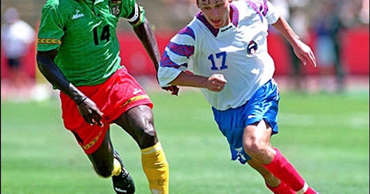 Илья Цымбаларь на чемпионате мира-1994 в США атакует ворота сборной Камеруна, в котором Россия выиграет – 6:1! Но даже такая уверенная победа не позволит россиянам выйти с группы и продолжить соревнования.