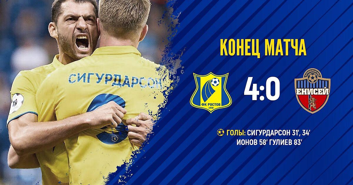 «Енисей» никак не заслуживал такого крупного поражения, но в этот вечер праздновал только «Ростов». На футбол, демонстрируемый ростовчане было любо дорого смотреть. В какой-то момент казалось, что хозяева трансформировались в звезд мирового уровня, так легко они организовывали свои все более острые контратаки. В добавленное арбитром время, обязан был забивать Паршивлюк, но вывалившись перед пустыми воротами, почему-то отдал на Шомуродова. Тот не был готов к такому повороту событий, и момент был загублен.