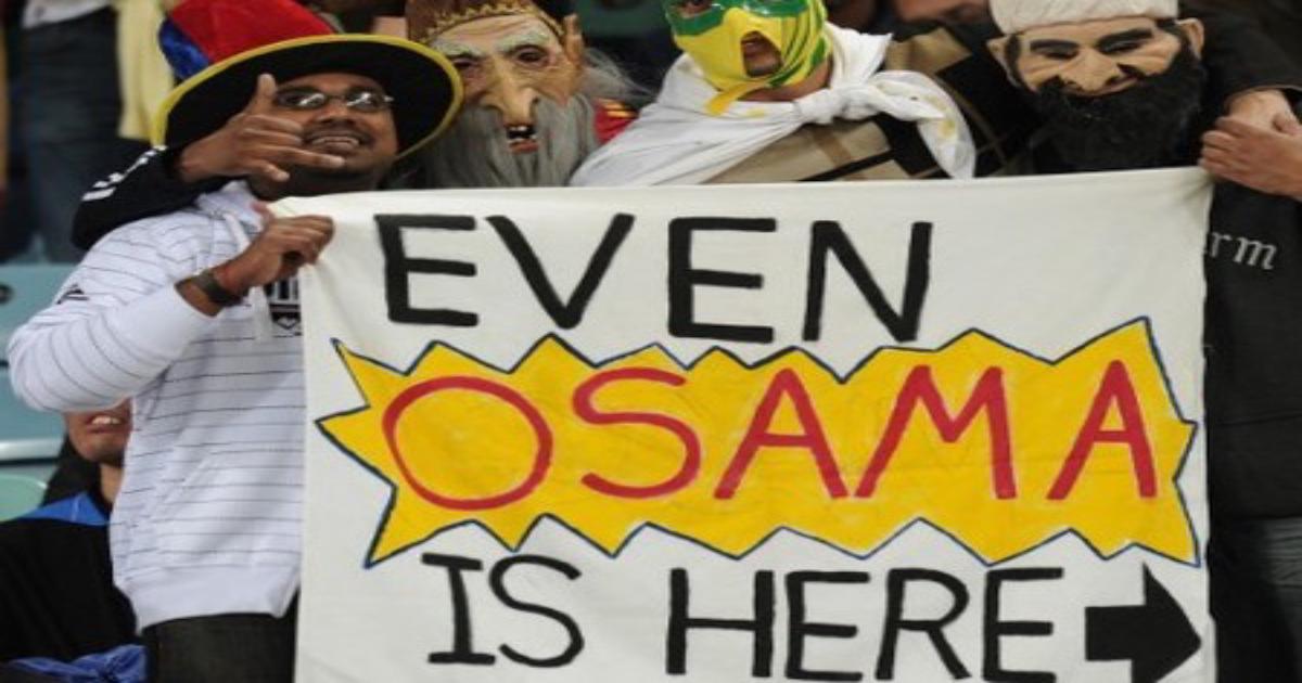ЧМ 2010. Полуфинальный матч между Германией и Испанией. Надпись гласит «Даже Осама здесь!».