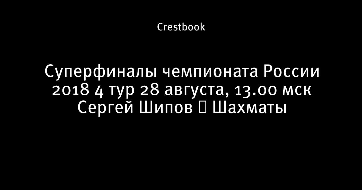 28 августа 2018, 01:49 Суперфиналы чемпионата России 2018 🇷🇺 4 тур ⏰ 28 августа, 13.00 мск 🎤 Сергей Шипов ♕ Шахматы Автор Crestbook Этот пост опубликован в блоге на Трибуне Sports.ru. Присоединяйтесь к крупнейшему сообществу спортивных болельщиков! Другие посты блога Увлекательные шахматы Валентина Гунина Владимир Федосеев суперфинал чемпионата России Суперфинал чемпионата России среди женщин Даниил Дубов Ян Непомнящий Александра Костенюк Сергей Шипов