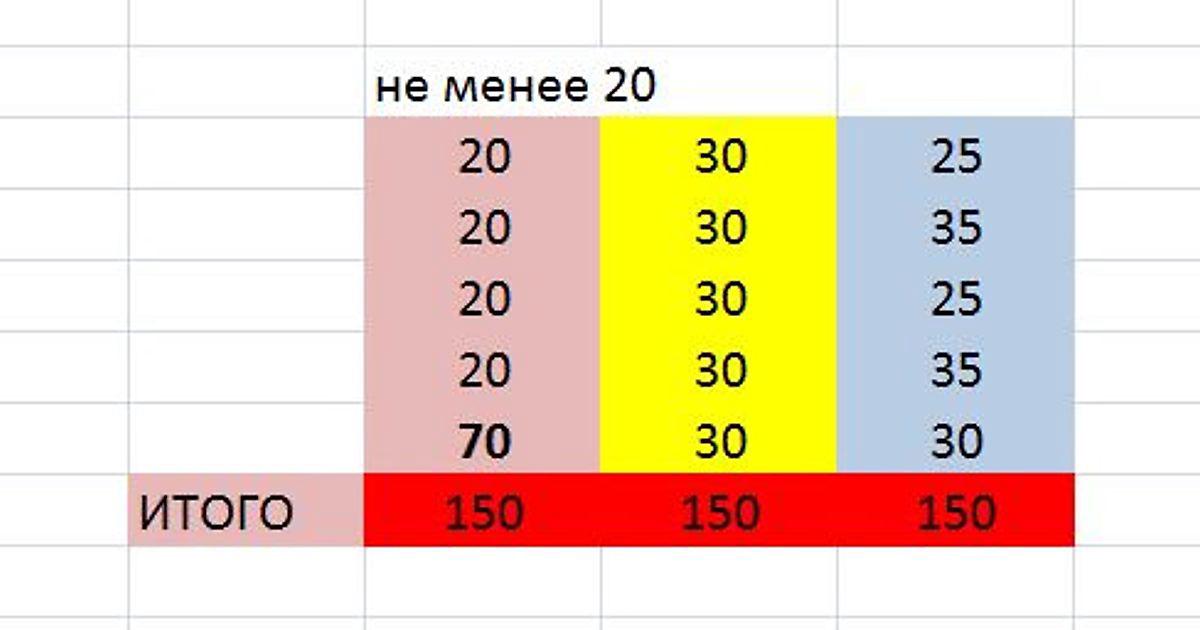 Вариантов комбинаций может быть очень много, это и 20-20-20-20-70, и 30-30-30-30-30 и 25-35-25-35-30 и так далее.