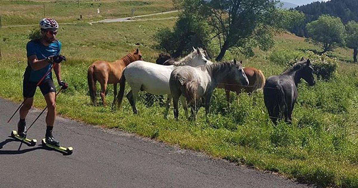 В шаге от своего дома или на краю света, с ним иногда случаются забавные встречи. Прошлым летом в Фон-Ромё он чуть не врезался в лань, катаясь на лыжероллерах. Он также встречает оленей, серн, зайцев, лосей, а однажды оказался посреди стада горных козлов.
