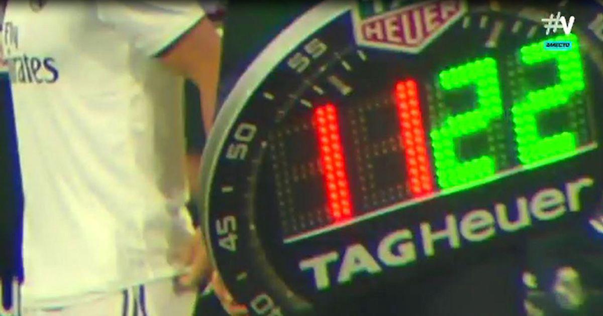 Электронная табличка четвертого рефери, попавшая в объектив камер" # Vamos de Movistar +", показывает замену: Иско на Бэйла, 22 на 11. Однако через минуту все изменяется и газон покидает Лука Модрич.