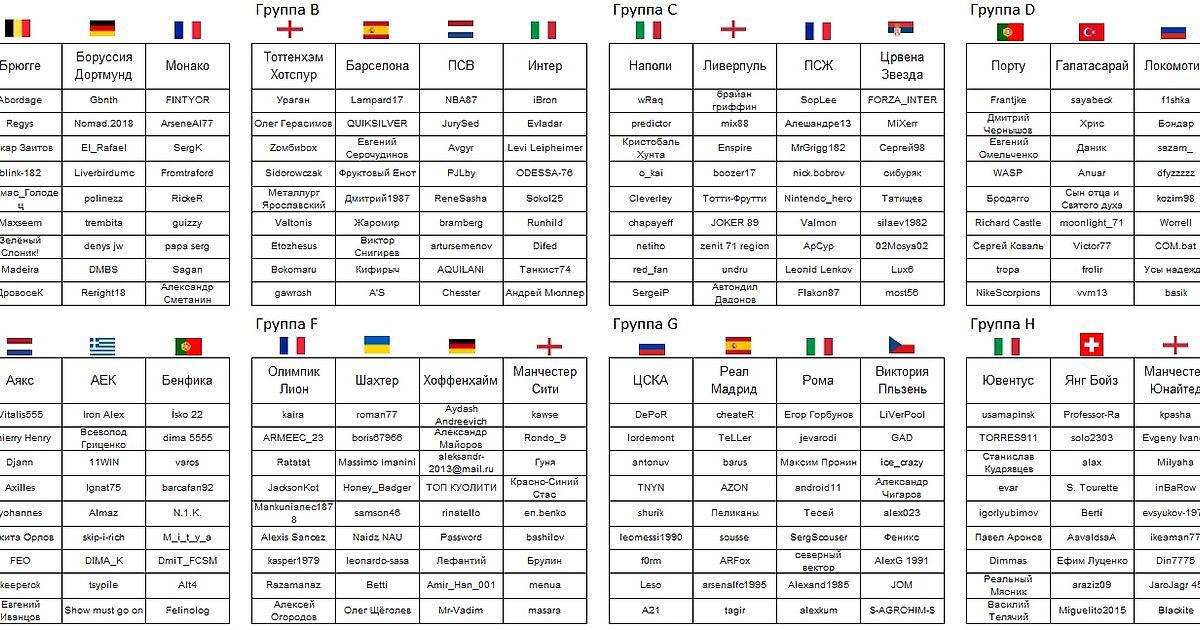 По итогам драфта мы получили 32 команды, состоящие из девяти человек каждая, которые в ходе жеребьевки стали соответствовать одной из команд реальной Лиги Чемпионов, на основании чего и были сформированные группы.