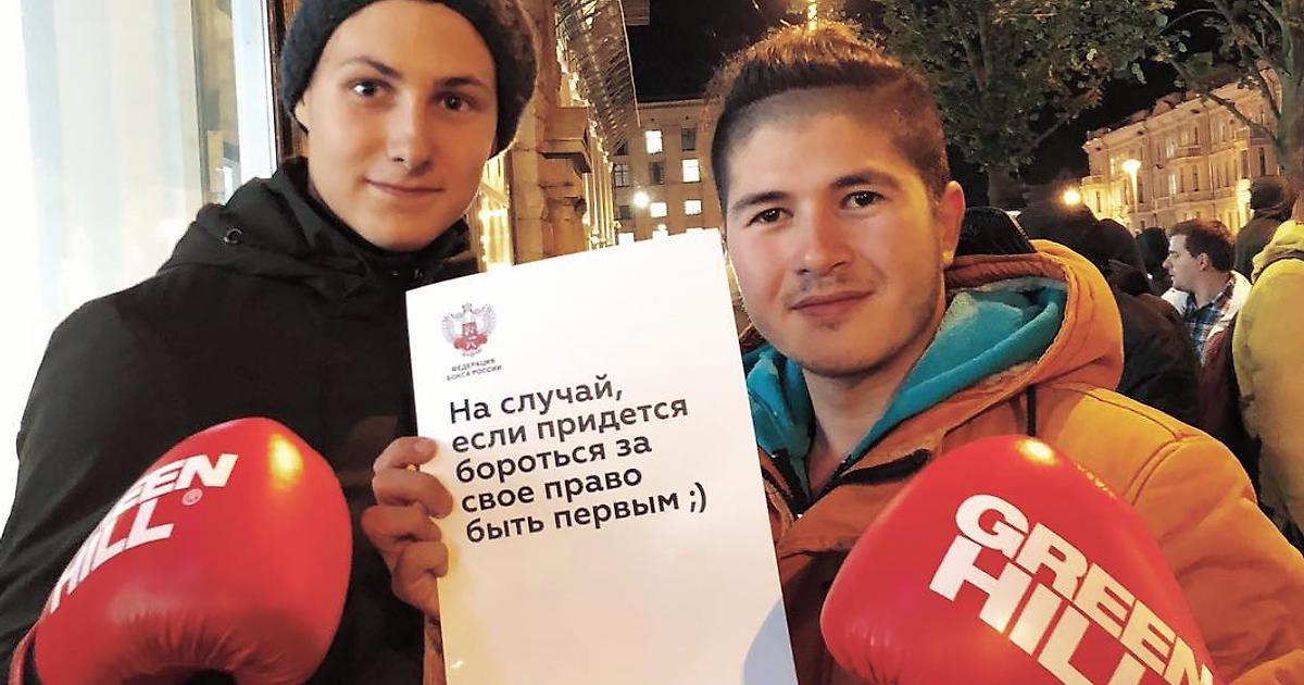 Федерация бокса России придумала шикарный способ напомнить о себе в этой ситуации. Двум парням, стоявшим в очереди первыми, подарили боксерские перчатки – «чтобы им было проще отстаивать свое место в очереди и отбивать желание у остальных лезть вперед».