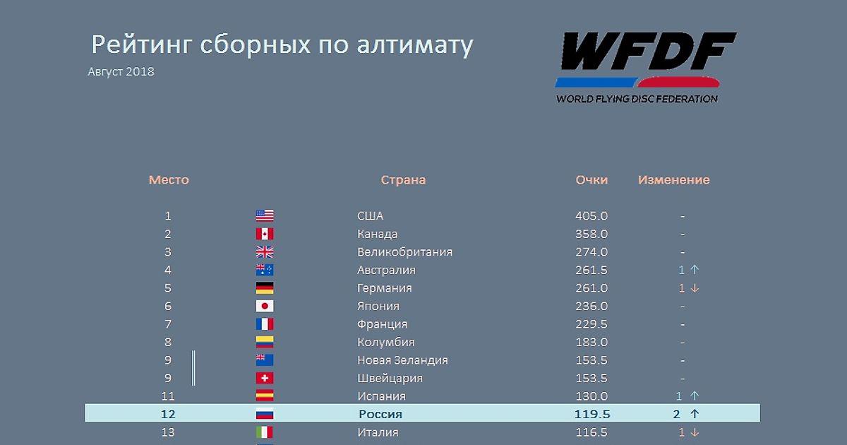 Всемирная федерация флаинг диска опубликовала новый рейтинг стран. Россия поднялась в нём с 14 на 12 строчку и теперь располагается за Испанией, на несколько пунктов опережая Италию. Идущие следом Филиппины прыгнули сразу на 9 позиций вверх.
