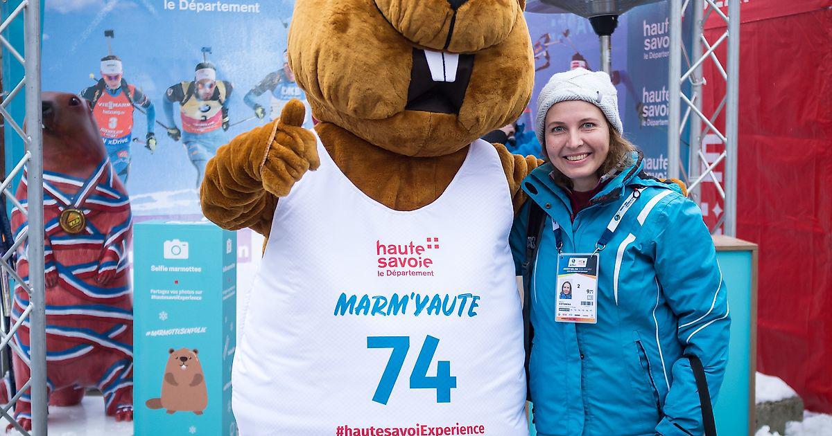 Перед входом на стадион все фотографируются с талисманами - сурками и горностаем :)
