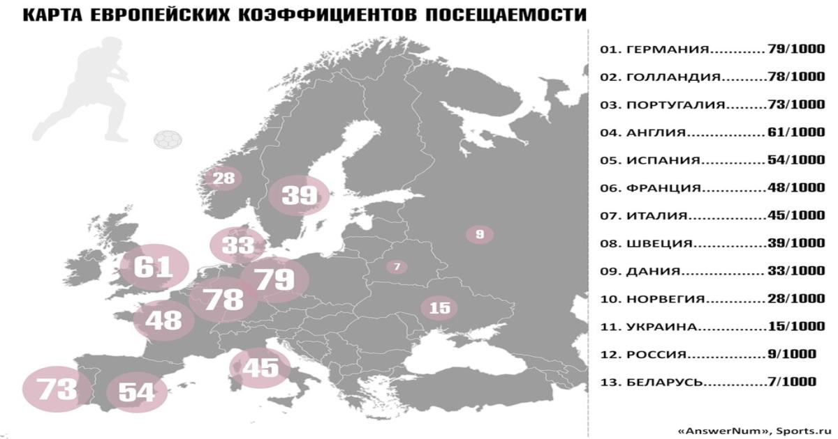 Как вы видите, в Германии 7,9% населения регулярно посещают стадионы. Рассказывать в чём причина данного великолепного показателя в этой статье не буду, займусь этим в следующей. На чуть - чуть отстала от своих соседей Голландия (7,8 процента), а следом за ней расположилась Португалия (73 португальца из 1000 поддерживают свои команды на стадионе). Однако численность населения иберийской страны в полтора раза меньше, чем страны тюльпанов, а по сравнению с количеством жителей Германии она вообще кажется мизерной. (10 (миллионов против 81). Далее идут Англия и Испания ( 61 и 54 процента соответственно), Франция, Италия... ну и т. д. Вы всё сами видите.