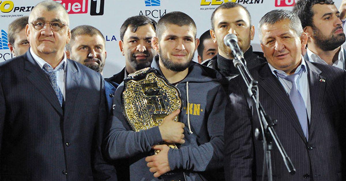 Хабиб появился на стадионе в сопровождении министра спорта Дагестана Магомеда Магомедова и отца Абдулманапа, который обещал наказать сына за поведение после боя в Лас-Вегасе: «Никакой оценке не подлежит тот момент, что Хабиб выпрыгнул из октагона. Дисциплина должна быть на первом месте. Думаю, заеду ему справа или слева прямо в аэропорту: «Чему мы тебя учили?» – шутил (а может и нет) днем Нурмагомедов-старший.