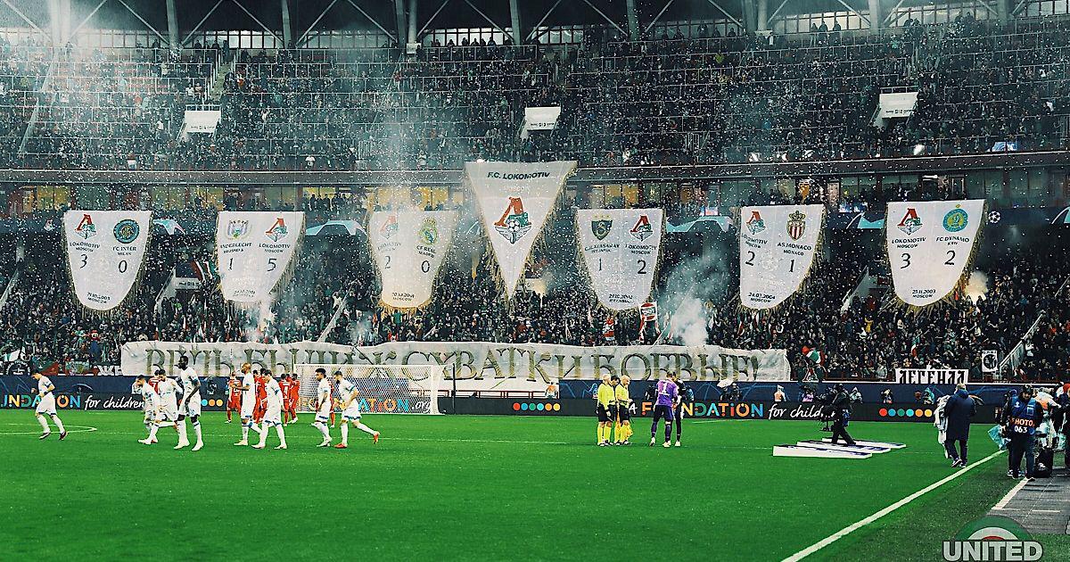 Фанаты из объединения UnitedSouth на матч с "Шальке" подготовили большой перфоманс на южную трибуну, основную часть которого составляли вымпелы с самых ярких победных матчей "Локомотива" в Лиге чемпионов. На верхнем ярусе были разложены конфетти (которые за день до матча нам запретили, но потом всё же удалось согласовать), нижний ярус украшали растяжки и несколько сотен флагов. Текстовый баннер содержал строку "Ведь были ж схватки боевые!" из стихотворения М.Ю. Лермонтова "Бородино".