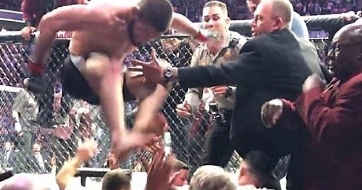 Тотчас после завершения поединка Хабиб перепрыгнул через клетку и атаковал спарринг-партнера Конора МакГргора – Диллона Дэниса.