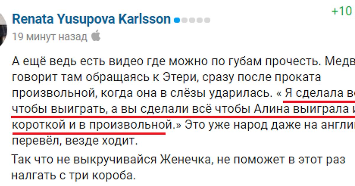 - действительно, почему все решили, что в своём поражении Медведева грешила на судейство? Может быть потому, что ей заранее было обещано золото? Ведь признавая справедливость судейства, Медведева в очередной раз указывает на виновников её горя - ТШ Хрустальный и лично Тутберидзе. Только и всего;