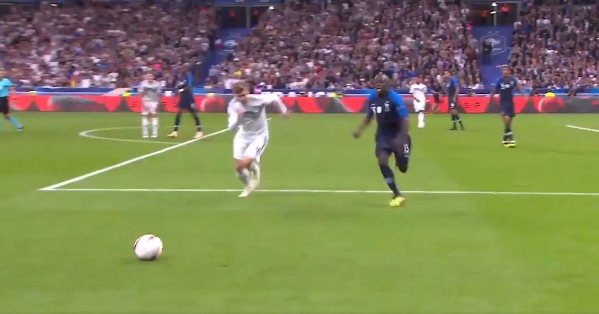 Во время матча Лиги наций между сборными Германии и Франции форвард немцев Тимо Вернер (180 см) и полузащитник французов Нголо Канте (168 см) пошли на уходящий мяч. Борьбы не вышло, Канте поставил плечо и Тимо отлетел на пару метров: