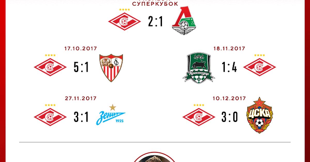 • В ЛЧ-2017/18 «Спартак» разгромил дома «Севилью» 5:1 и не проиграл «Ливерпулю», однако две ничьи с «Марибором» и 0:7 в последнем туре с «Ливерпулем» отправили москвичей только в Лигу Европы. Там в первом же раунде «Спартак» проиграл «Атлетику».