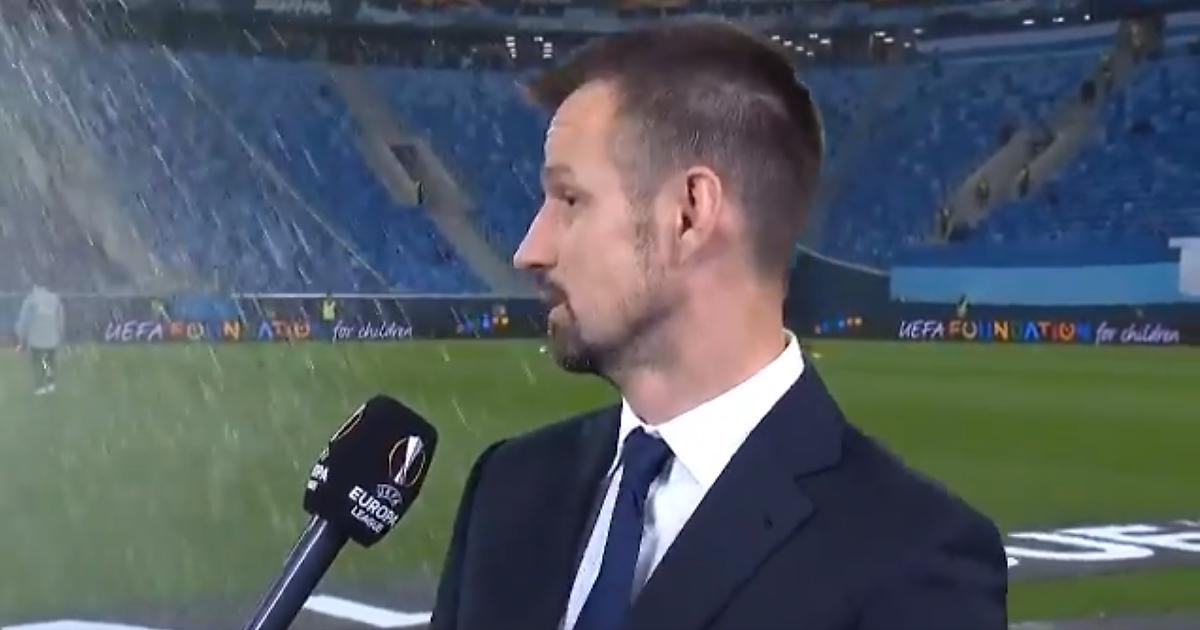 Тренер «Зенита» Сергей Семак давал предматчевое интервью, но в дело вмешалась поливалка для газона. Семак – профи, и костюм не намочил, и интервью закончил.