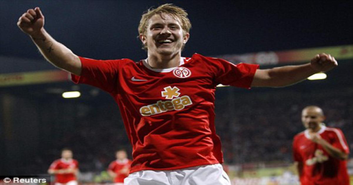 Льюис светит своей тату на левой руке и одновременно празднует гол в игре за Майнц.