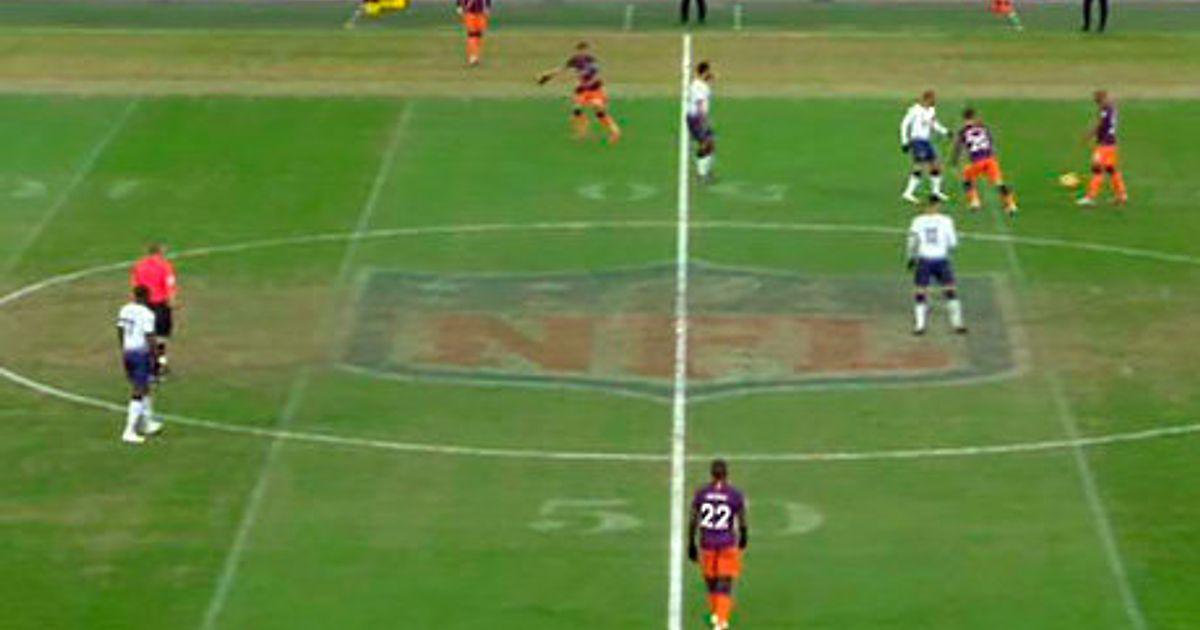 В результате команды Почеттино и Гвардиолы играют на поле с разметкой для американского футбола и огромным лого НФЛ прямо в центральном круге.