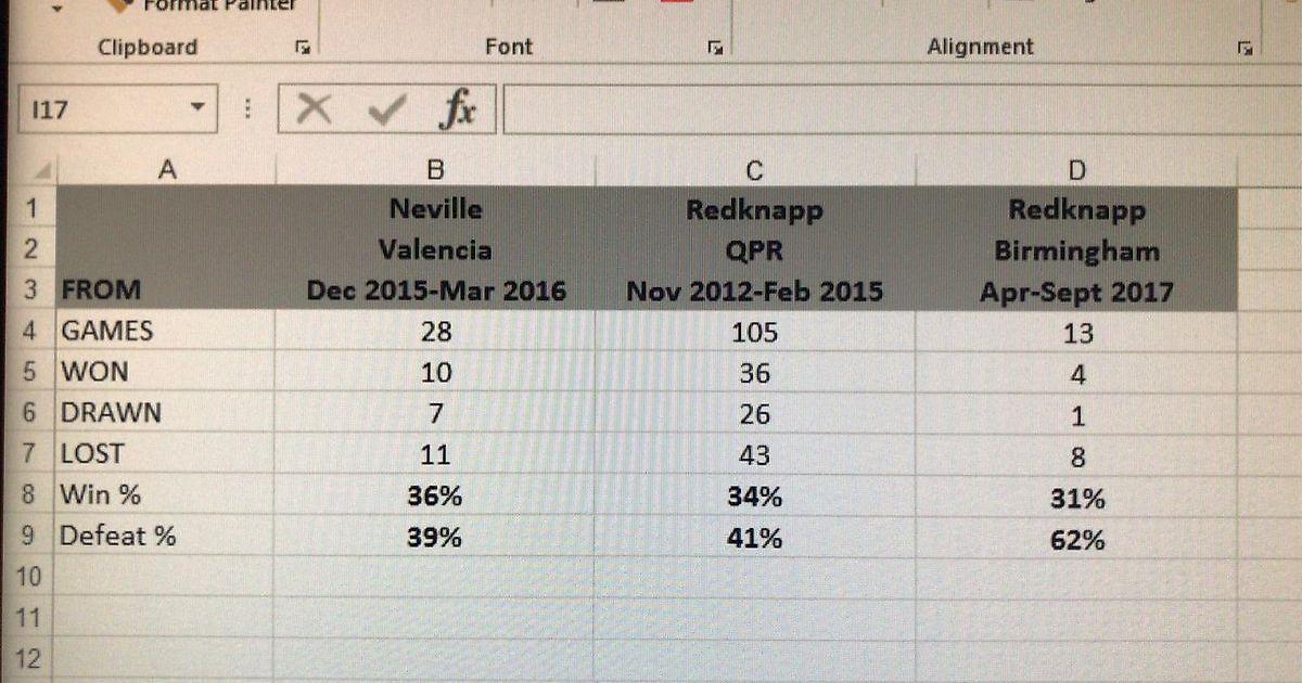 Пояснение: за время работы в «Валенсии» Невилл показал бОльший процент побед и меньший процент поражений, чем Реднапп на двух последних местах работы — в КПР и «Бирмингеме».