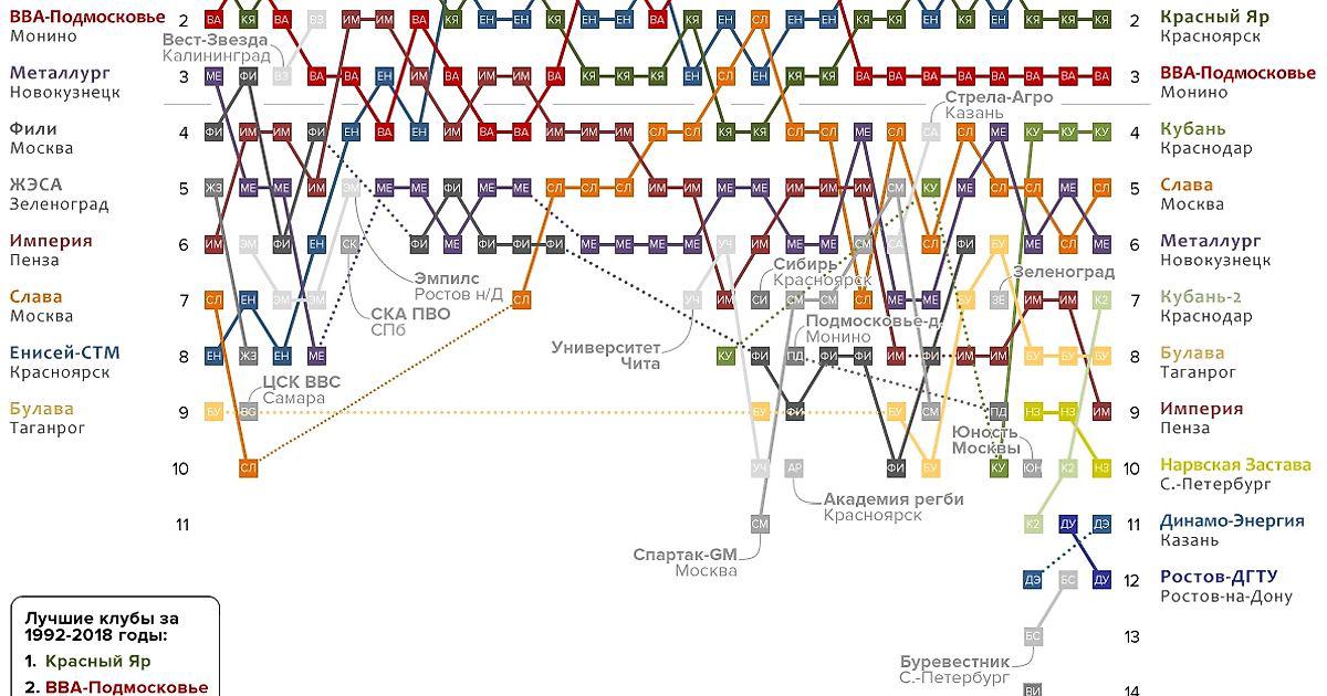 Итоговое положение клубов в чемпионате России по регби с 1992 года