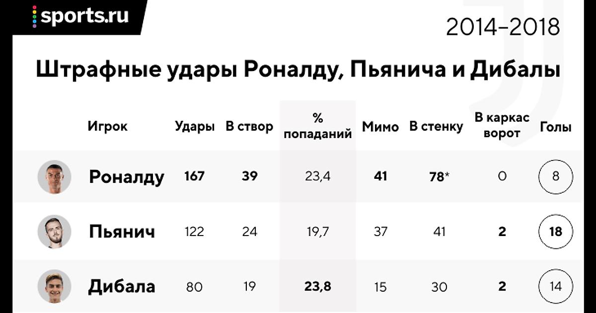 • По данным InStat (запрошены Sports.ru после матча «Ювентуса» против «МЮ»), в этом сезоне Криштиану 28 раз бил штрафные, из них 9 – в створ. У Пьянича и Дибалы – по 3 удара (0 в створ). А вот статистика за последние 5 сезонов (4 полных + 3,5 месяца текущего).