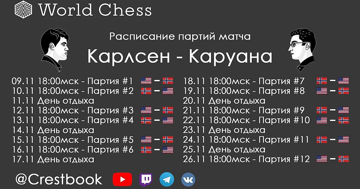 9 ноября 2018, 16:14 Карлсен - Каруана. Расписание партий Наш канал на ютубе (комментирует МГ Сергей Шипов) Мы вКонтакте, в Telegram Автор Ростислав Трач Этот пост опубликован в блоге на Трибуне Sports.ru. Присоединяйтесь к крупнейшему сообществу спортивных болельщиков! Другие посты блога Увлекательные шахматы Фабиано Каруана Магнус Карлсен матч на первенство мира