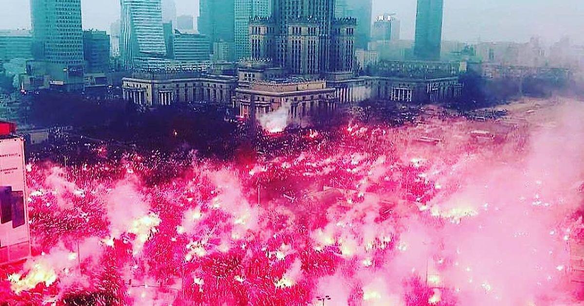 На шествие в центре польской столицы традиционно съезжаются группировки футбольных фанатов со всей страны – в этот день они не враждуют, а вместе выступают под флагами Польши. В этом году собрался один из самых больших митингов в истории страны – пришло около 300 тысяч человек.