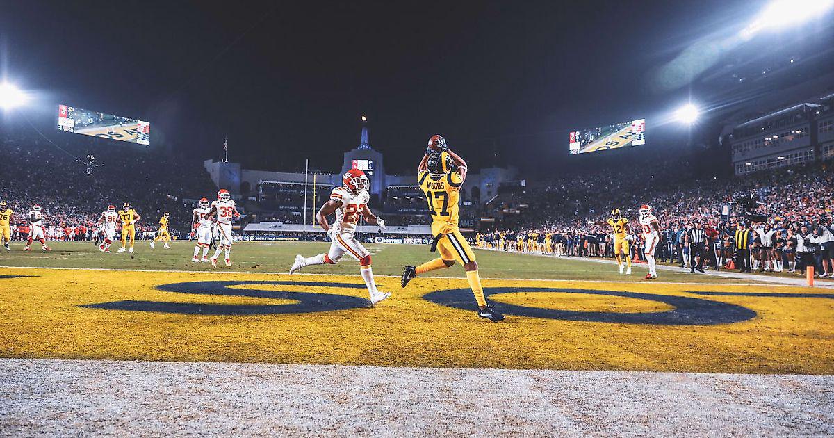 "Лос-Анджелес Рэмс"-"Канзас-Сити Чифс" 55:51.Гости проиграли 3 четверть с разницей в 10 очков,а в 4 смогли лишь догнать хозяев.Квотербек хозяев Джаред Гофф заработал 413 ярдов и 4 тачдауна,ресивер Брэндин Кукс имеет в активе 107 ярдов.Квотербек гостей Патрик Махомс заработал 478 ярдов,6 тачдаунов и допустил 3 перехвата,ресивер Тайрек Хилл имеет в активе 215 ярдов и 2 занесёных тачдауна,тайт-энд Трэвис Келче заработал 127 ярдов и занёс один тачдаун."Бараны" прервали победную серию "вождей".