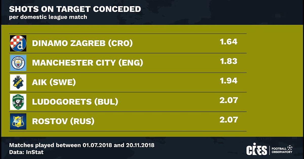 Лишь один российский клуб попал в первую десятку одного из таких рейтингов. «Ростов» — занимает пятое место в Европе по наименьшему в среднем за матч числу допущенных в створ ворот ударов. В среднем за игру соперники наносят в створ ворот команды Евгения Карпина 2,07 удара за матч. Лидером по данному показателю является загребское «Динамо» — 1,64 удара за матч.